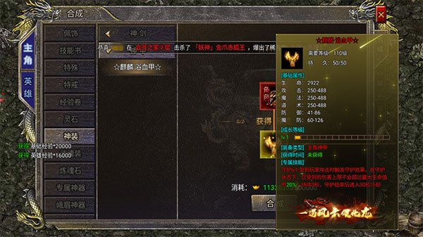 神甲装备是【☆麒麟·浴血甲☆】,这件装备佩戴等级为110级,仅供主角佩戴,而英雄暂时无法佩戴;这把神剑的属性效果,如下: