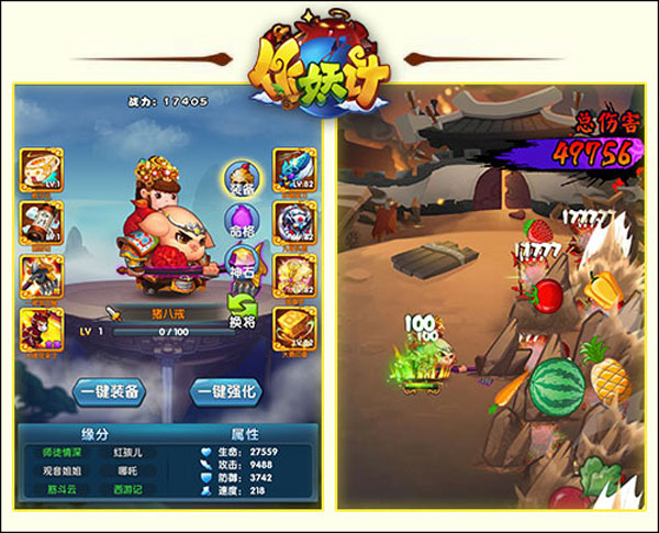 (2)三藏(佛)、八戒(妖),皆属橙色卡牌,二人同时上阵,释放“大师兄来了”合体技,可召唤悟空与猴群进行群攻,试想群猴救“湿父”是何等的壮观。