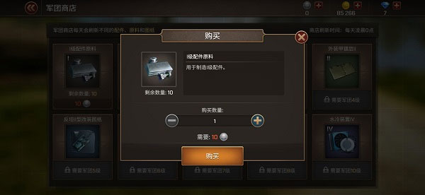 通过军团捐献、完成军团任务等途径可以获取军团币,在军团商店中所有物品都只能由军团币购买。军团商店每天会刷新不同的配件、原料和图纸,且每种物品数量有限;买完的话今日就无法再次购买,只能等待每天的凌晨0点系统自动刷新军团商店。
