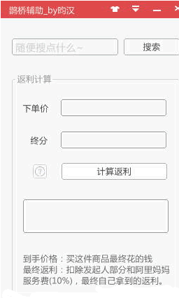 阿里妈妈鹊桥辅助(淘宝购物返利软件)是一款可以帮助用户在淘宝购物得到高返利的软件。一般来说淘宝上面的商品,都是付费推广的,通过这款软件这样我们就可以买东西,返现金进自己的口袋。软件支持置顶,自动侧边隐藏,可调透明度,而且软件启动后直接显示在右下角托盘,使用起来得心应手。如果不喜欢默认皮肤,可以点右上角小衣服图标进行切换,20余款皮肤随意选。计算返利功能,到手价格就是你买这件商品最终要花多少钱,最终返利是扣除发起者部分和阿里的服务费(10%),自己最后能拿到的返利,至于还有一些补贴什么的,不计算在内,软件算出来的是大概的数值。