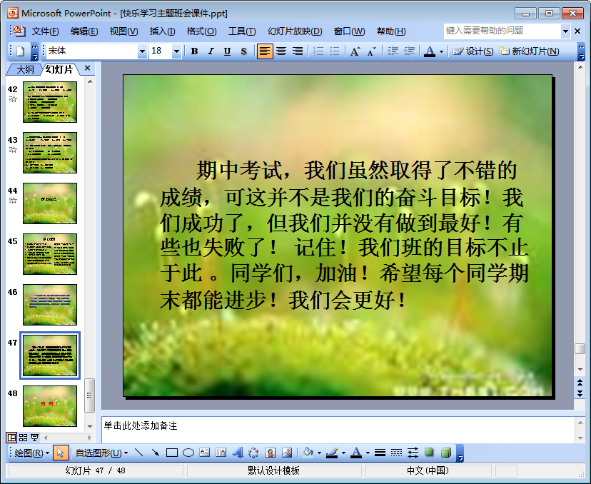 期中考试,我们虽然取得了不错的成绩,可这并不是我们的奋斗目标!我们成功了,但我们并没有做到最好!有些也失败了! 记住!我们班的目标不止于此 。同学们,加油!希望每个同学期末都能进步!我们会更好!