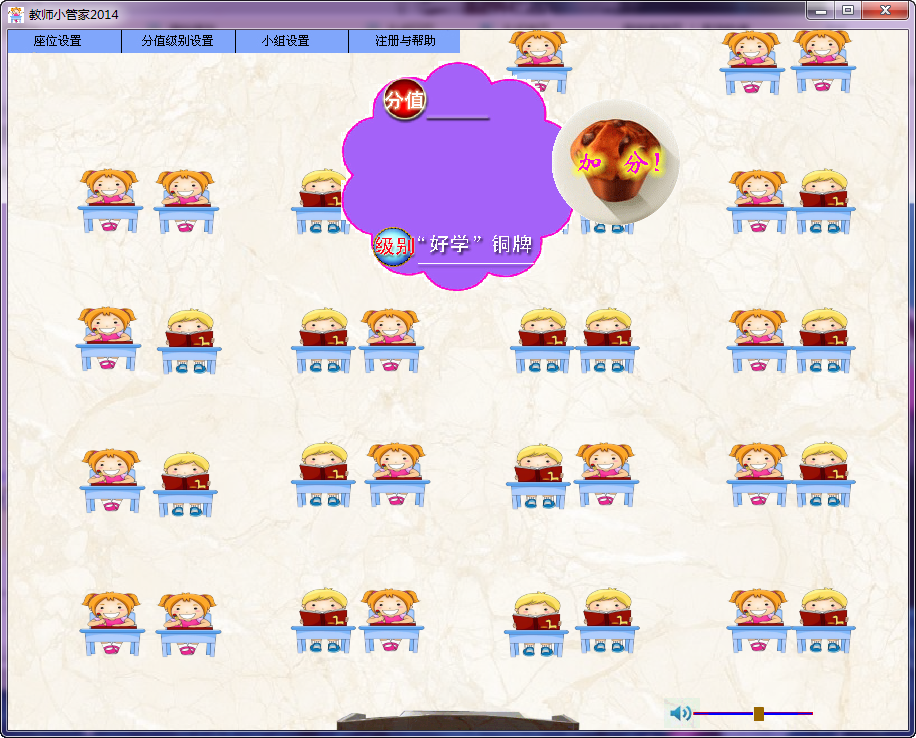 教师小管家2014软件针对小学生的年龄特点,在全班学生电子座位基础上通过加分、扣分的方法,以游戏级别的方式,增强学生学习的兴趣,开发了这款教育教学辅助软件,是小学各年级班主任的福音,确实是班级管理、教学辅助的好助手。界面活泼生动,动画符合孩子的心理,经过许多一线教师的使用,深受好评。