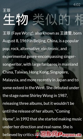 ZPlayer拥有非常强大的网络媒体库,当安卓手机用户播放歌曲的时候,能够自动查找到该艺人的出道信息、相关专辑及其评论以及类似歌手的推荐。小编手中测试用的ZPlayer最新版已经支持中文版,不过很明显翻译水平还不过关,居然把人物简介翻译成生物了,而且简介也是英文版的,希望以后的版本中对中文的支持会得到改进。