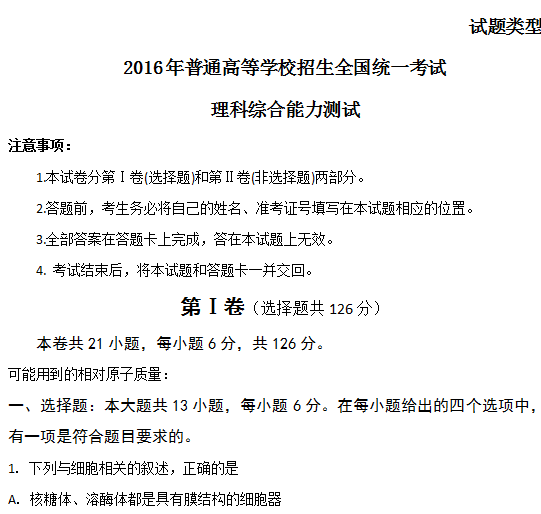 2016年安徽省高考理综试题及答案(全国I卷) doc免费下载 马上就高考了,全国各地考生都在积极准备中,小编为各位安徽籍的考生带来了2016年安徽省高考理综试题及答案(A卷+B卷),考生们可以下载先温习一下,这里面的真题几率还是很高的,绝密试卷哟!小心使用!先做一遍再参考评论: 0条 大小: 2.9M 更新时间: 2016-06-06