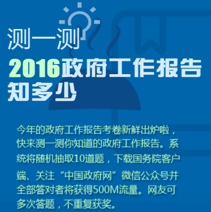 2016年政府工作报告知多少答案大全 txt 最新版【免费得500M话费】 马上5.1,又是三天小长假,很多朋友要出去玩了,担心没流量太快没网怎么办,现在参加国务院“测一测2016政府工作报告知多少”就能获得500M流量,只要答对10道题就可以免费得哟,而且不限制次数,活动一直到5月15号评论: 0条 大小: 11.4M 更新时间: 2016-04-29