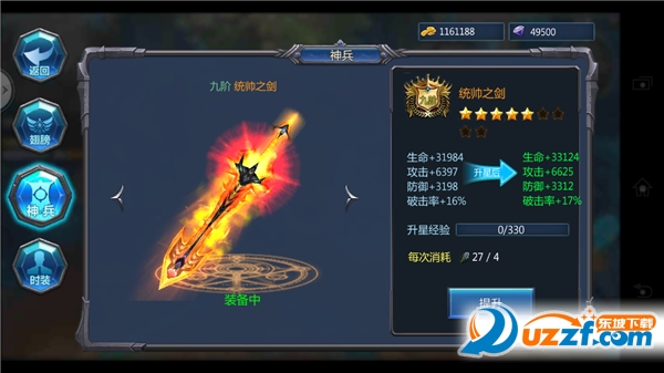 2、 神兵进阶时,使用“神兵进阶石”可以获得进阶经验,升星经验值提升满后,即可达到下一阶(星级),进阶过程中提升经验值有几率出现多倍暴击效果,获得大量经验。
