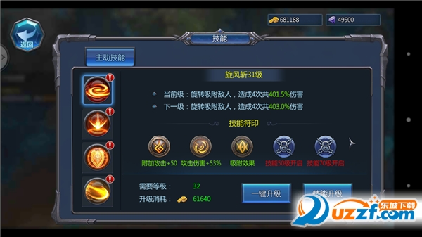 【主动技能】随等级提高可以学习更高等级技能,技能等级越高,伤害越高。技能每提升10级开启一个技能印符,每个等级的技能印符附加效果不同,如伤害附加,减伤,buff持续时间增长等。主动技能升级需要消耗金币。