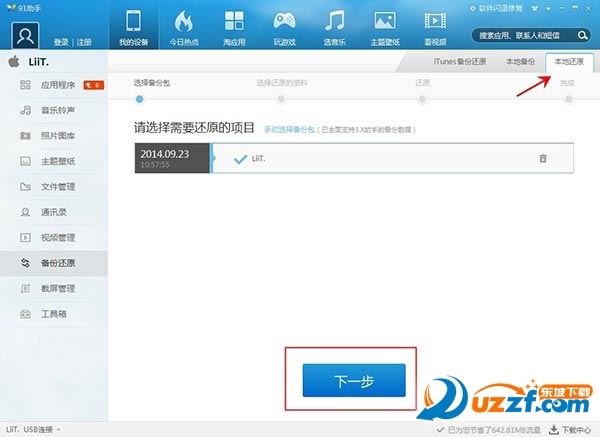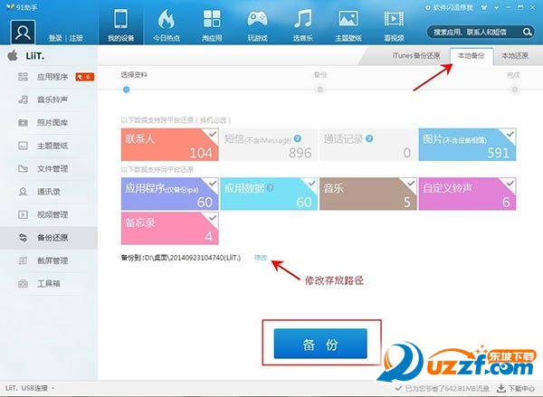 2、选择本地还原,勾选您需要备份的信息(如:通讯录、照片、应用程序等等。注意:手机未越狱是无法备份短信与通话记录的)还可以更改您的备份路。