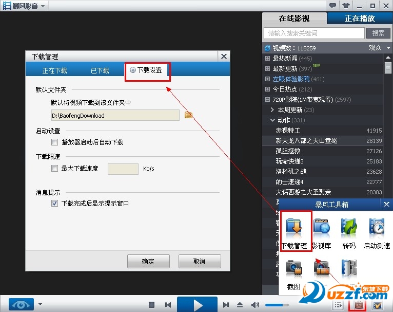 如果您想设置下载路径,可以打开右下角暴风工具箱中的下载管理,进行相关设置;