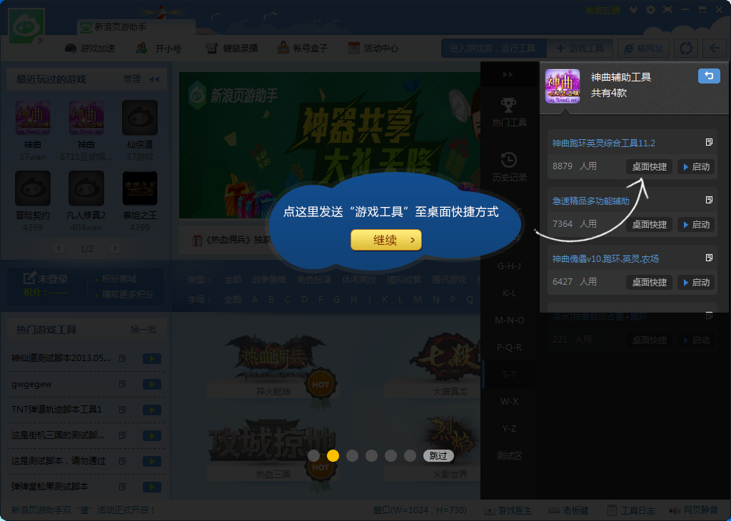2、右边是游戏辅助工具,点击【桌面快捷】将辅助发送到桌面上