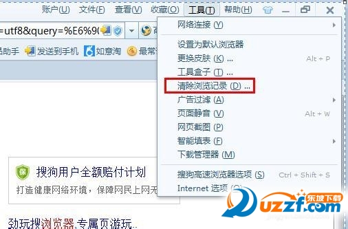 打开搜狗浏览器,在搜狗的菜单上选择“工具”→“清除浏览记录”进入。如图: