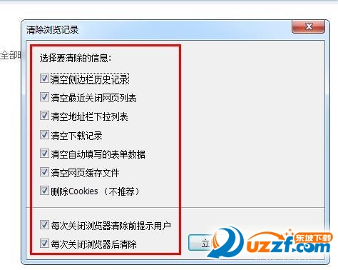 全部勾选清除的信息选项,然后“点立即清除”,建议勾选“每次关闭浏览器后清除”,这样就不用自己手动去清除,更好的提高浏览器的浏览速度和安全。如图: