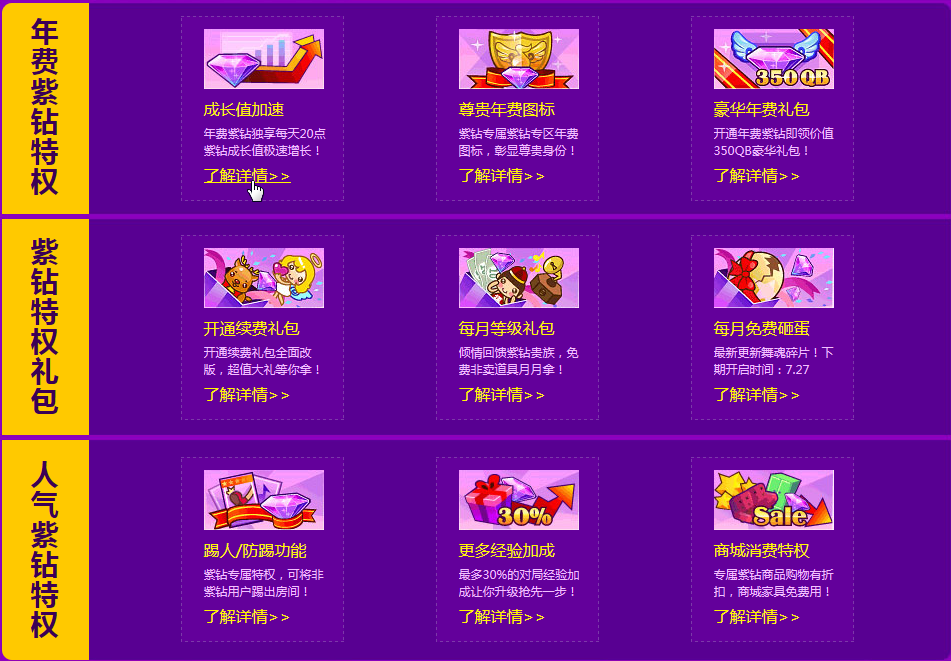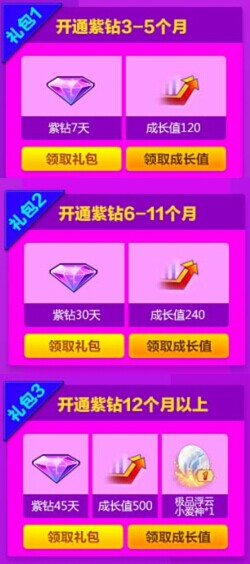 一次性开通不同时长的紫钻即可在活动页面领取对应的礼包。开通的月数越多,您可以得到的紫钻天数和成长值就越多。例如选择开通12个月紫钻会员,除了可以得到相应12个月紫钻会员资格外,还将额外获得45天紫钻会员资格、500点紫钻成长值、极品宠物蛋1个!