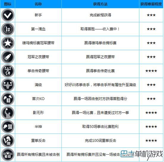 游戏中奖杯的数量并不算多,但有的奖杯拿起来相当困难。比如最难的奖杯获得需要硬的所有锦标赛且未被击倒,这是在是太难。玩家几乎是很难完成的,当然游戏奖杯还是很好拿的,比如玩家只要完成教程,都能获得新手奖杯一枚。