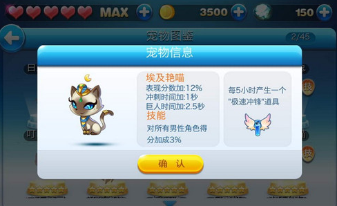 天天酷跑积分商城更新,将原来的白玉灵猫换成了埃及艳喵,同样需要天天酷跑积分兑换,价格为7888积分。天天酷跑埃及艳喵是神话传说中天宫陪伴嫦娥的仙兔。这个天天酷跑PVP新宠物可以加成表现分数、冲刺时间和巨人时间。天天酷跑埃及艳喵不仅可以每5小时产生一个“急速冲锋”道具,更厉害的是对所有男性较色得分加成3%,是不是爽翻天?