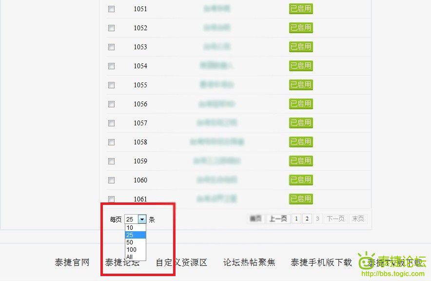 目前自定义的当前选择页有5种选择,有每页10条、每页25条、每页50条、每页100条ALL,大家可以根据自己的需要设置不同的选择。