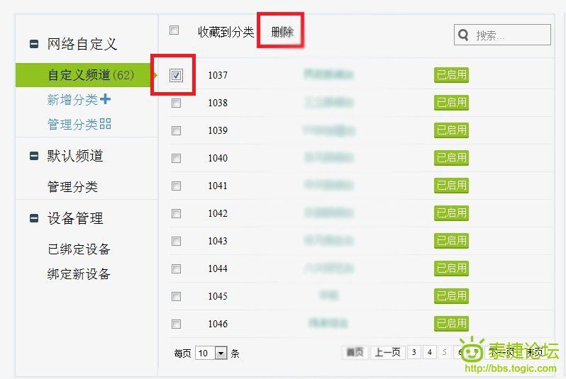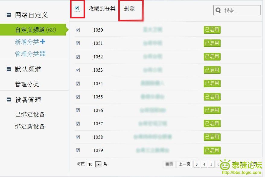③ 你要全部删除当前显示页的节目源,按顶部的框进行全选,然后点删除。
