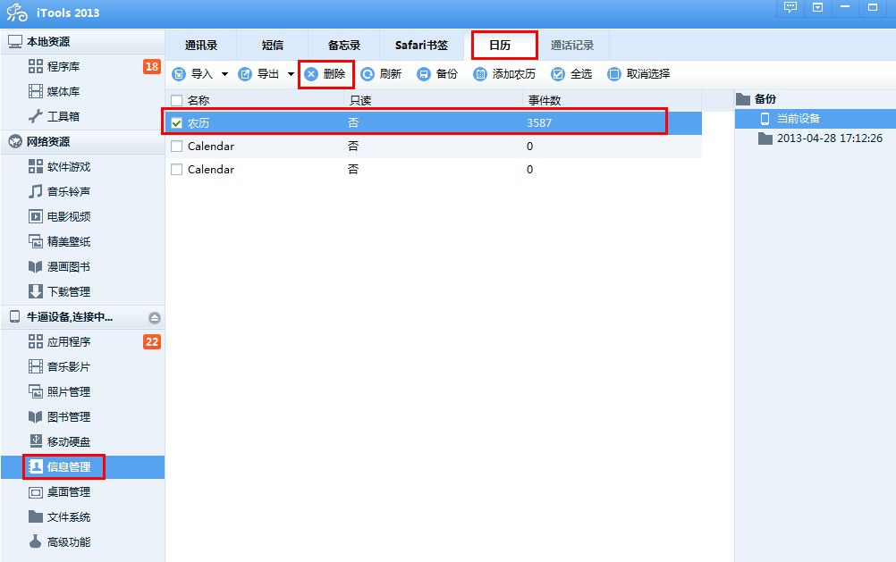 1.将设备连接到iTools,打开信息管理-->日历,找到“农历”,并进行勾选