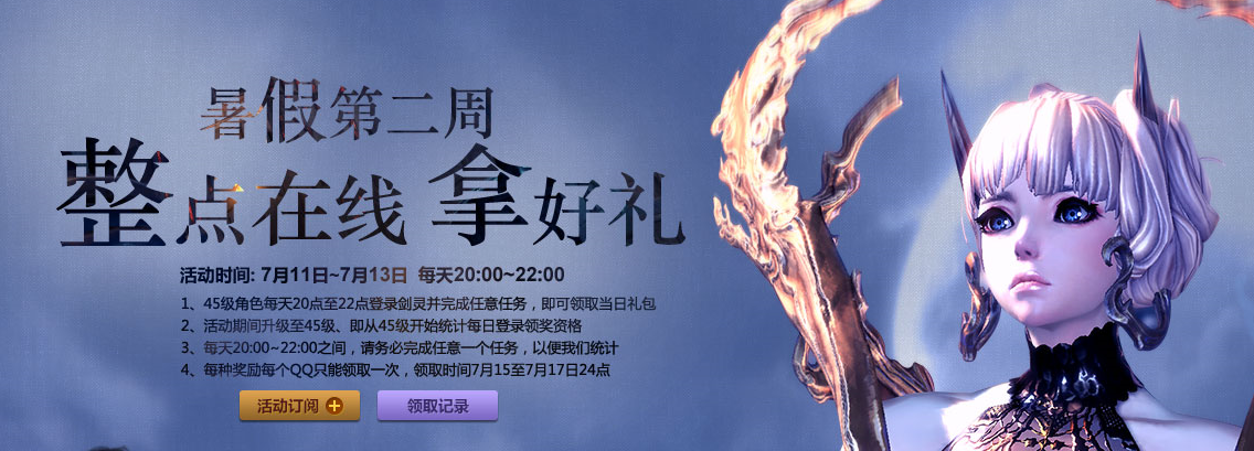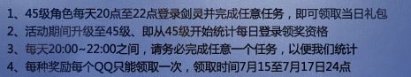 2、我们将每天统计在线QQ,为了保证您的利益不受损失,在20:00~22:00活动时间内登录剑灵,并且登录后,领取任意任务并完成,以便我们统计。