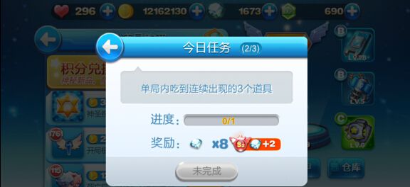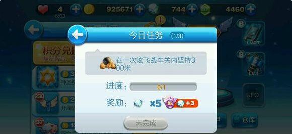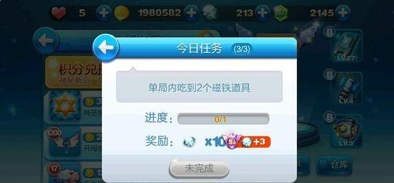 首先说一下,炫飞游戏中会出现带翅膀的道具,有冲刺道具 保护盾(有时间限制) 星星(一段时间内将金币变成高分五角星) 磁铁(吸金,超级模式下依然有效!) 很简单 此任务就是吃两个磁铁