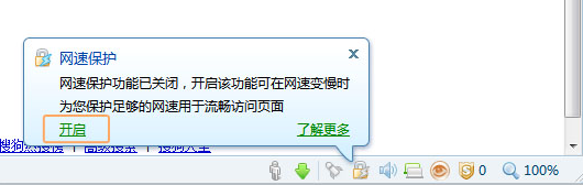 (1)请看看您是否开启了网速保护功能,请点击浏览器右下角“锁”样式图标查看,如果没有开启,请点击“开启”按钮开启,如图所示: