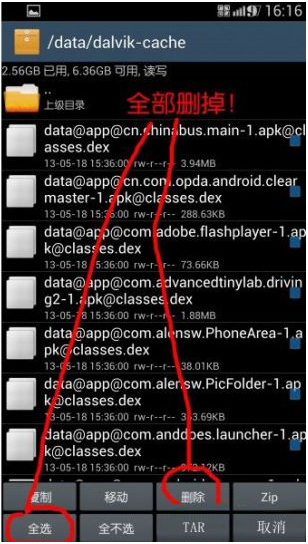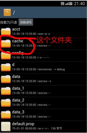 1.打开RE管理器,第二个文件夹为cache,大家都知道双wipe的时候会有一个wipe cache.就是这个文件夹了.进入之后把里面的全选删除.