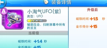 UFO类似酷跑模式中的宠物,是跟随在玩家身边的,主要属性是增加磁铁时间和增加金币得分。目前有四种UFO,分别是炼金UFO、鹰眼UFO、小淘气UFO、雷神UFO,不一样的UFO作用各不相同。有的是能让导弹坠落,有的能扫射豆豆,选择你所喜欢的UFO一同上阵吧。