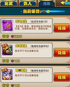 2、比武排名奖励改为奖励改为奖励荣誉点,关羽武魂1个碎片需要100点荣誉点。