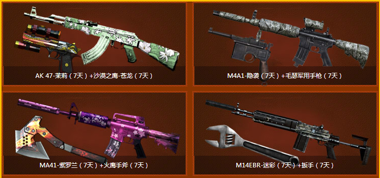 抽奖可以获得AK 47-茉莉(7天)+沙漠之鹰-苍龙(7天),M4A1-隐袭(7天)+毛瑟军用手枪(7天),MA41-紫罗兰(7天)+火鹰手斧(7天),M14EBR-迷彩(7天)+扳手(7天)
