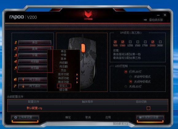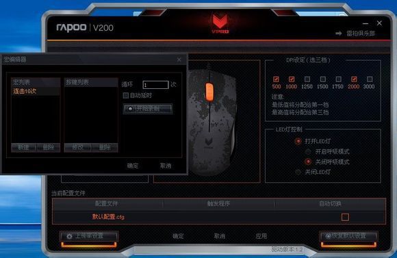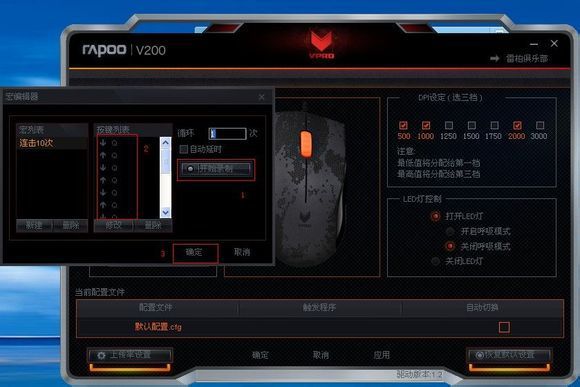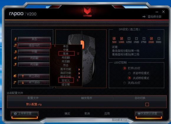 回到驱动主界面,你的菜单键现在就变成了宏定义键“连击十次”,如果现在你不准备玩游戏,点开这个键的菜单,把它还选为“菜单”键就可以了,玩游戏之前改成宏定义键就OK。V200一共有4个宏定义键,每个键都可以设置多个宏。
