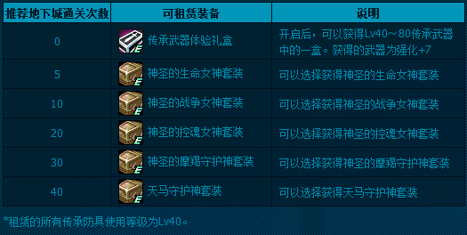 活动期间,Lv40及以上的男枪手角色通关地下城达到规定次数即可租赁传承武器和传承套装。