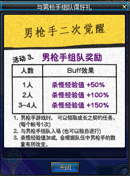 活动期间,与男枪手组队通关地下城可以获得杀怪经验加成!