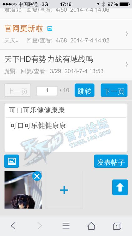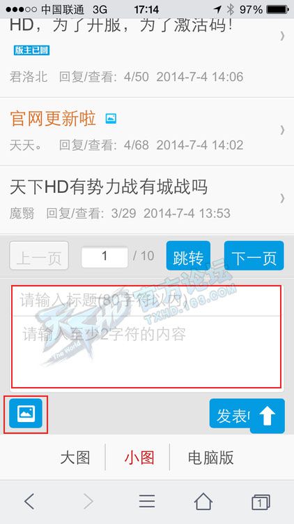 进入版块后,主题列表下拉到最下方就是发主题贴的选项了,选择左下角的图片按钮。(在一个帖子页面的下方则是回复)