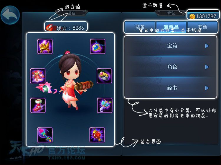 背包分装备、消耗品、其他三个栏(点击切换),每个栏中的物品还有分类。