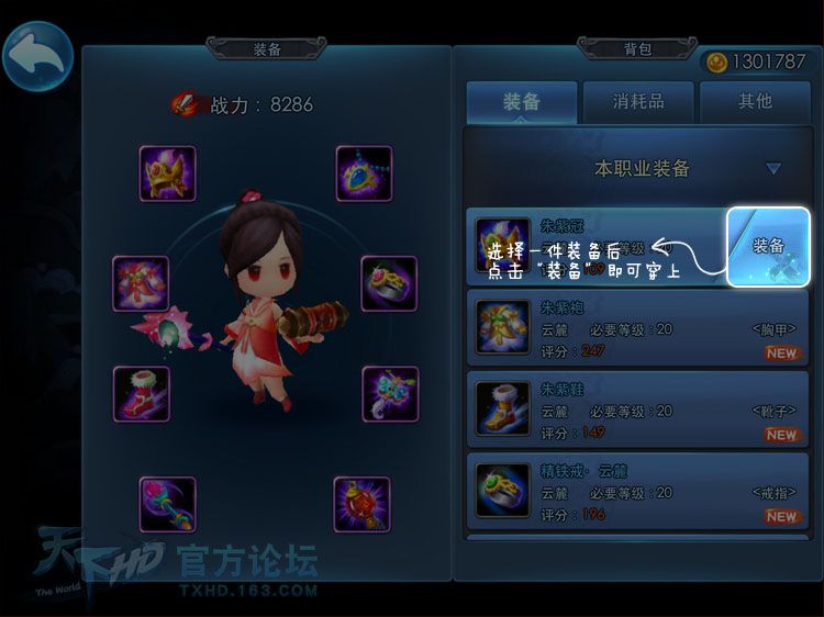 非常简单,比如装备,我们点击一下即可选择一件装备,然后会出现”装备“的字样,点击即可穿上了哦,同理”消耗品“也是通过这种方法进行使用的。