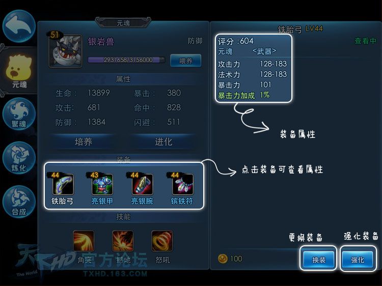 ⑥装备:我们可以在这里查看元魂装备,更换元魂装备,强化元魂装备哦