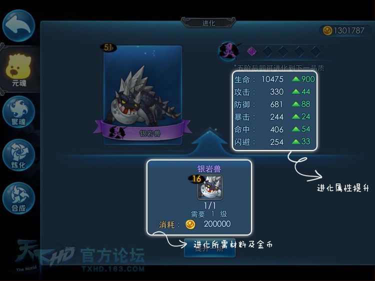 ⑤进化:在这里可以使用同种元魂作为材料进化元魂,使元魂的品质上升;