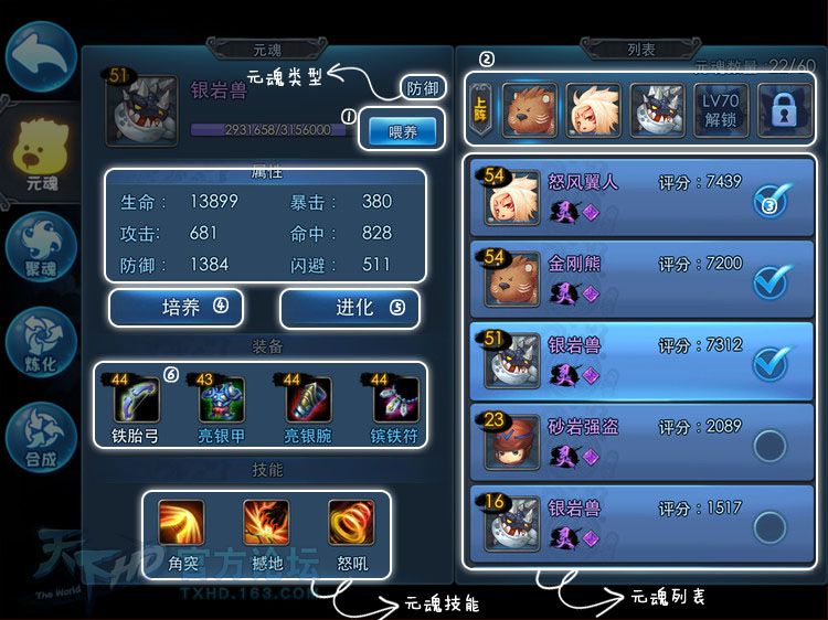 ①喂养:在这里我们可以给元魂喂养口粮从而快速的提升元魂的等级哦;