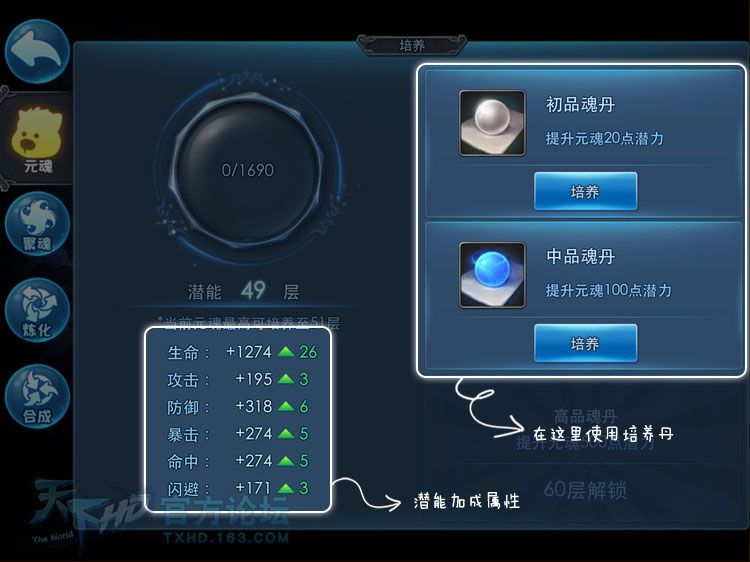 ④培养:在这里可以使用魂丹培养元魂的潜能哦,从而增加元魂的各方面属性;