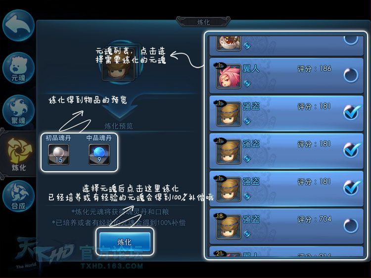 炼化:没用的元魂我们怎么处理呢?我们就可以用它们来炼化,从而获得魂丹,而元魂被炼化后是会消散的,要注意别把有用的元魂残忍的炼掉哦,已经培养过的或有经验的元魂炼化后是可以得到100%补偿(魂丹和口粮)。