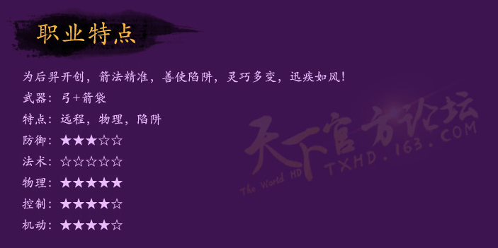翎羽:弓箭手。从职业上特点上就可以看来。物理,机动,控制都很高。绝对的pvp高手,尤其是控制技颇多!只要属性相差不大,越级PK易如反掌 ...