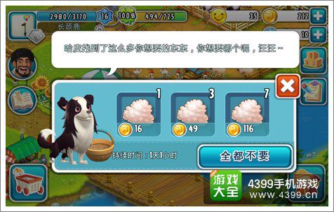 4.点击寻找回来的哈皮,会显示3个不同数量的物品信息,点击需要购买的数量;最后哈皮将根据需求重新出发,将物品带回农场。