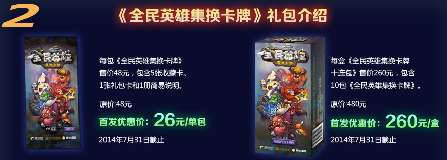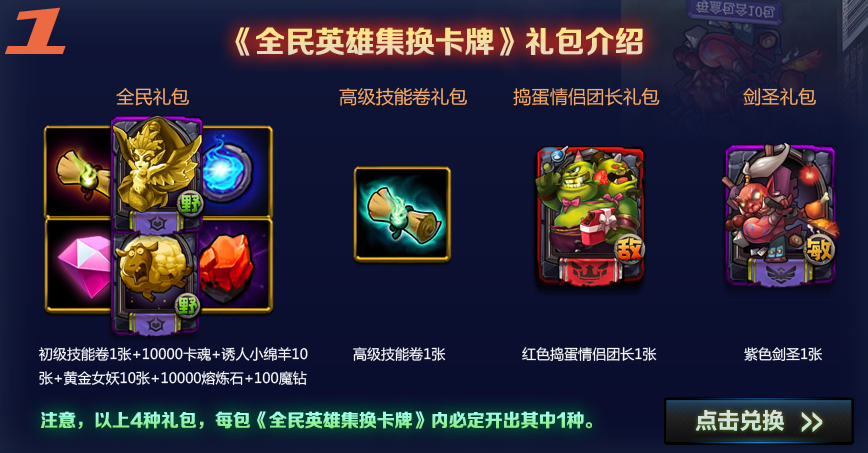 活动规则:活动期间,玩家可通过活动链接地址可以优惠价购买《全民英雄》集换卡牌,每一位购买卡牌的玩家都可以获得游戏内礼包兑换号码,获得之后按照活动地址页面提示进行兑换。