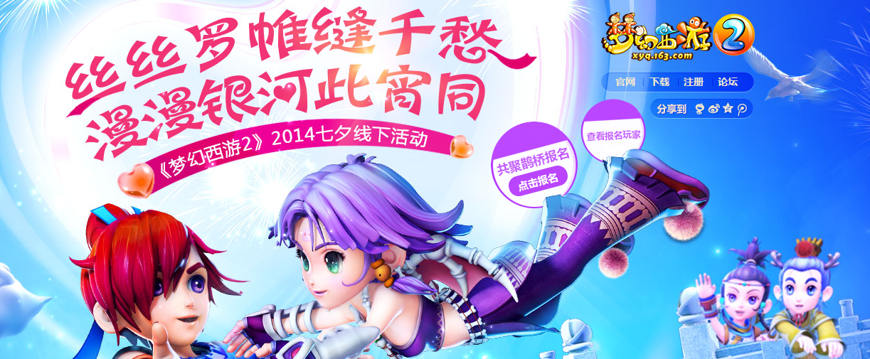 报名时间内,《梦幻西游2》游戏中的夫妻账号可在专题页面点击“共聚鹊桥”进行报名。
