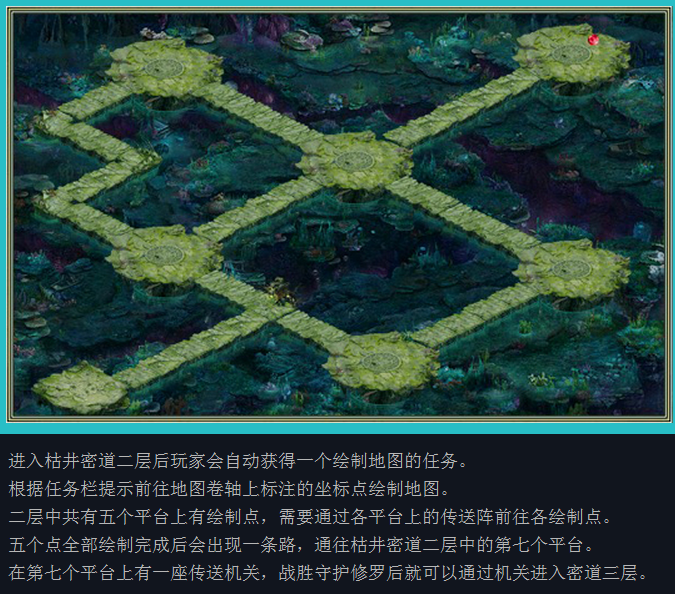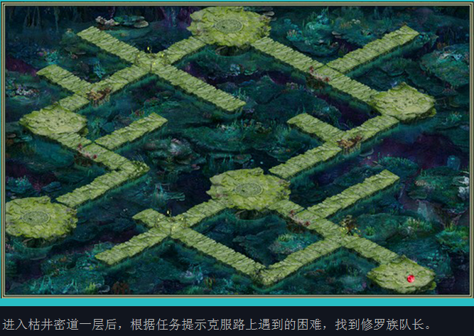修复好罗盘后再次与神秘罗盘对话,选择开启机关。机关开启后需要到(312,100)处找到进入修罗故地的密道入口——枯井。跳入井中后即可进入枯井密道一层。