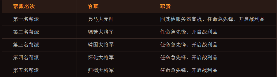 获得参与玩法资格的服务器,在每周周一0点系统,系统会按照各个帮派的威望进行重新排序,威望排名前五帮派帮主,则被任命相应的官职。