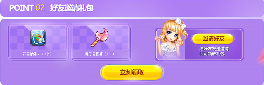 3、即使你不是本月幸运星,邀请好友,你也能获得好友礼包,礼包是群发邮件卡(1个)和月牙棒棒糖(1个)!