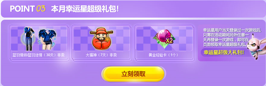 5、幸运星用户当天登陆过一次游戏后,只需在活动期间另外任意一天再登陆一次游戏,即可在页面领取幸运星超级礼包!
