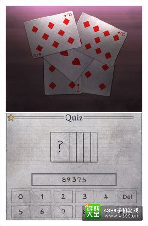 2、第二颗星星也很容易找到,最底下的桌子上面有一堆扑克,根据露出的部分我们就可以得知整组数字为89375,那么找到桌子的QUIZ,输入密码89375就可以得到第二颗星星了;