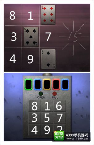 7、根据已知的信息,已知密码73946,不同花色所代表的颜色,根据手中的扑克牌,就可以得出73946所对应的颜色是绿蓝黄红蓝,先将大门密码盘上的颜色调成绿蓝黄红蓝对应,之后再对应刚才九宫格的数字,我们得知了密码键盘每一个按键对应的数字,最后输入73946,就能打开门了!